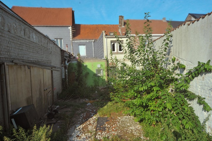 Derrière la maison se trouvent un petit jardin urbain et une place de parking.