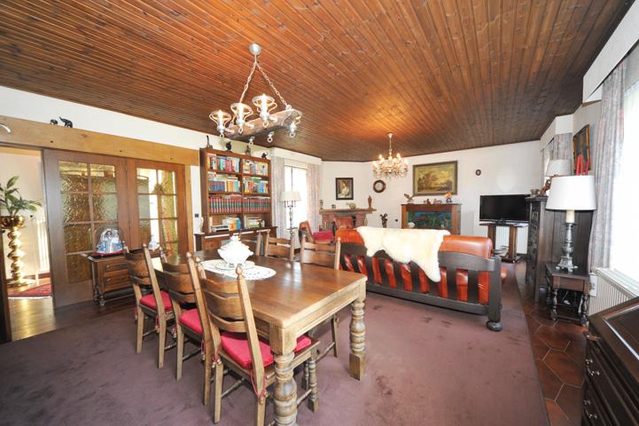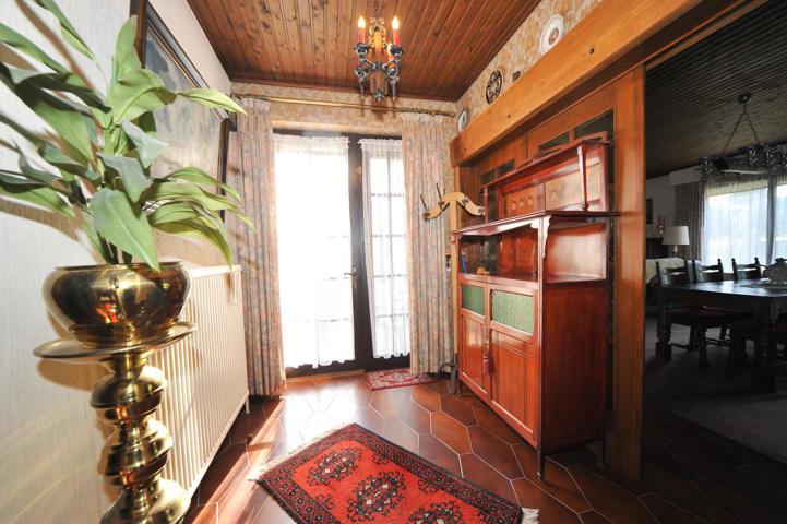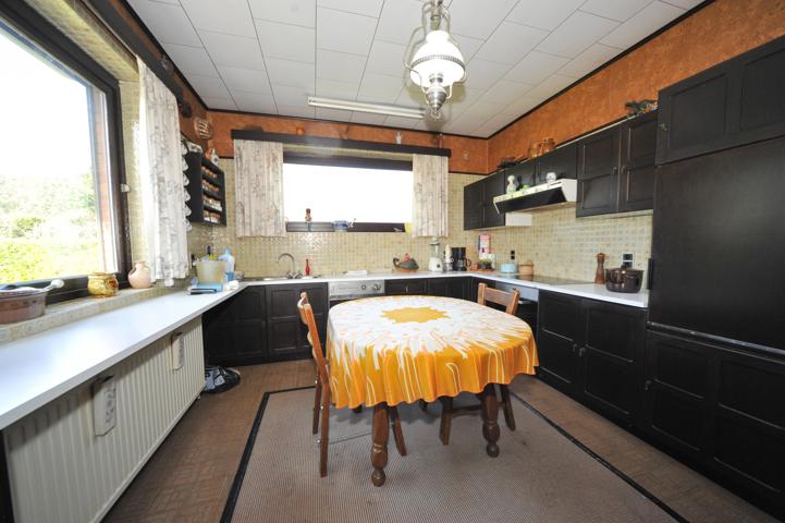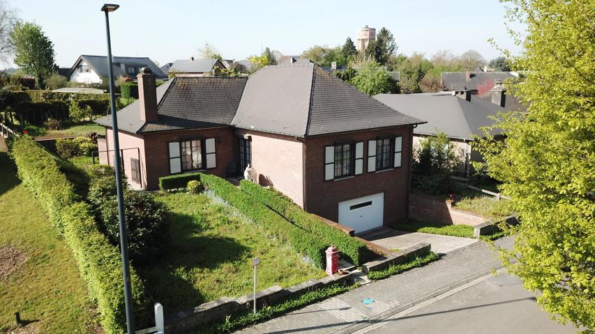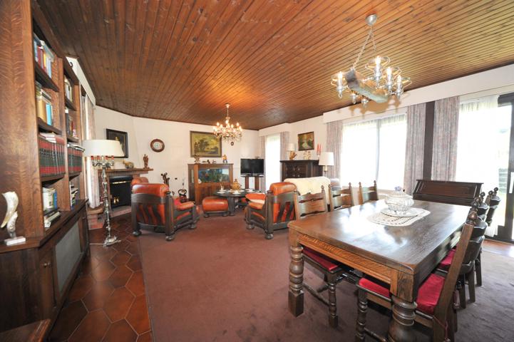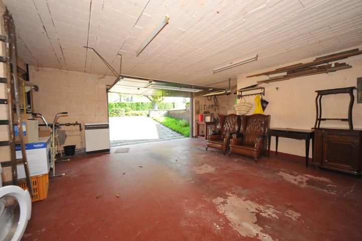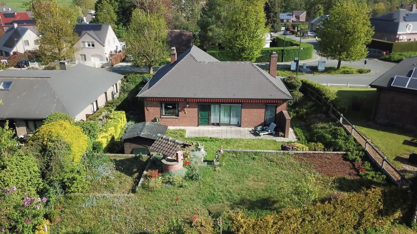 Zeer gunstig gelegen bungalow woning in residentiële woonwijk nabij invalswegen. De woning, traditioneel gebouwd in 1973 werd goed onderhouden, sedert dien evenwel niet meer opgefrist. Een totale opfrissing/renovatie dring zich aldus op. De woning beschikt op gelijkvloers over een inkomhal die toegang biedt tot enerzijds de woonkamer en anderzijds de slaapkamers en verder loopt in de nachthal. De woonkamer is een ruime open ruimte met plaats voor een zithoek en eethoek. Deze werd voorzien van een open haardvuur en veel raamwerken in aan de noord- en zuidkant van de woning. Hoewel deze vele raamwerken is de leefruimte donker d.m.v. donkere tegelvloer en donker hout planchetten op het plafond. De keuken is ruim en geînstalleerd, doch verouderd. De ruimte is ruim genoeg voor een eettafel. De keuken werd betegeld op de vloer en tussen werkblad en hangkasten. Plafond werd afgewerkt met houtvezel tegels. De nachthal beschikt over een gastentoilet en biedt toegang tot de kelder en de badkamer. De badkamer werd voorzien van een ligbad en dubbele wasbak, de vloeren en wanden werden betegeld, plafond afgewerkt met houtvezel tegels. De badkamer is eveneens verouderd. Beide slaapkamers werden voorzien van een tapijtvloer, dezelfde plafondtegels en behangen muren op pleister. De woning voldoet niet aan de huidige energienormen (CV, raamwerken, isolatie gebouwschil). Verwarming via een centrale verwarming op stookolie via radiatoren. Raamwerken in hardhout met ouder dubbel glas. De kelders en inpandige garage zijn droog, ruim en voorzien van een egale betonvloer. Muren en plafonds werden niet afgewerkt. De inpandige garage is toegankelijk via een manuele kantelpoort. Achter de woning ligt een breed terras met silexdallen, een af te breken tuinberging en zuidgerichte tuin in twee niveau's (verschil van 6 treden). De tuin werd tegen de aanpalende percelen omheind. Het volledige perceel is gelegen in woongebied met landelijk karakter en is niet gelegen in overstromingsgevoelig gebied.