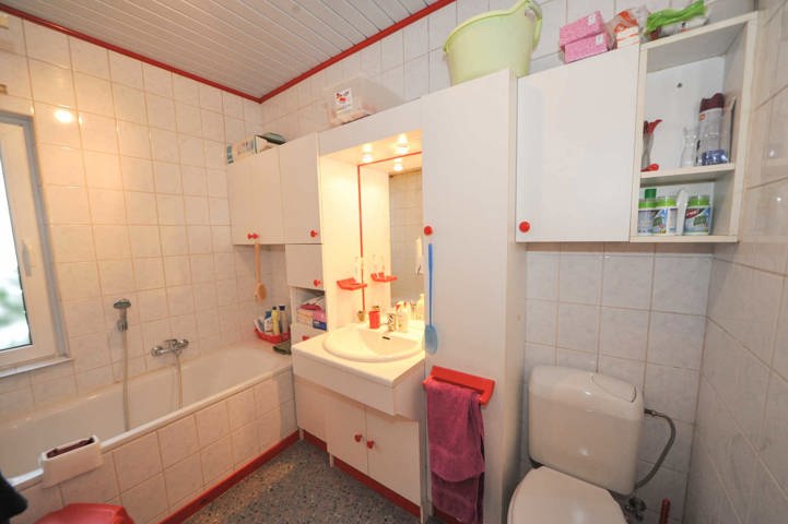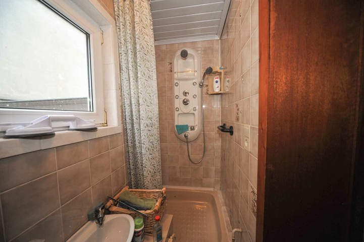 De woning kent een zeer praktische indeling: een inkomhal die toegang biedt tot de inpandige garage, de buitenkoer met berging en bureau. Op de eerste verdieping bevindt zich een open woon- en eetkamer, aanpalend een gedeeltelijke geïnstalleerde keuken, een eerste badkamer met bad en toilet en een tweede badkamer met douche en toilet.