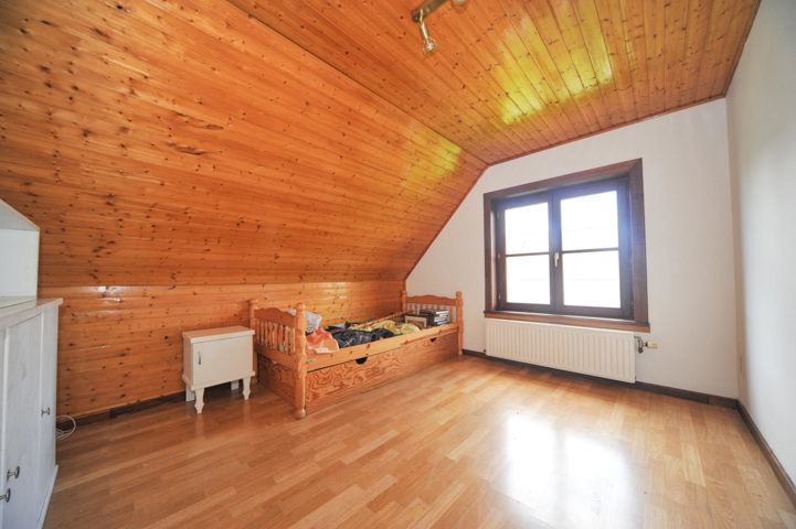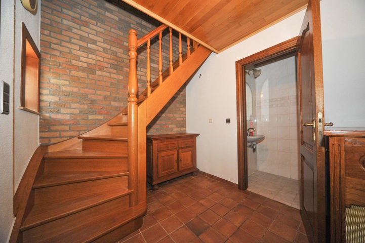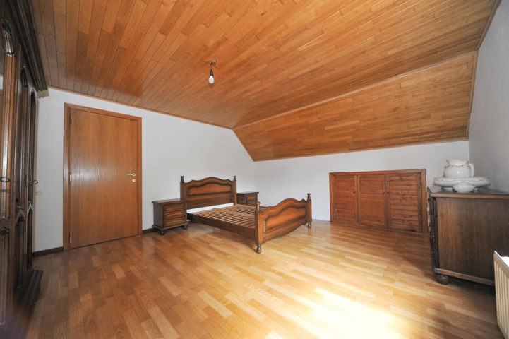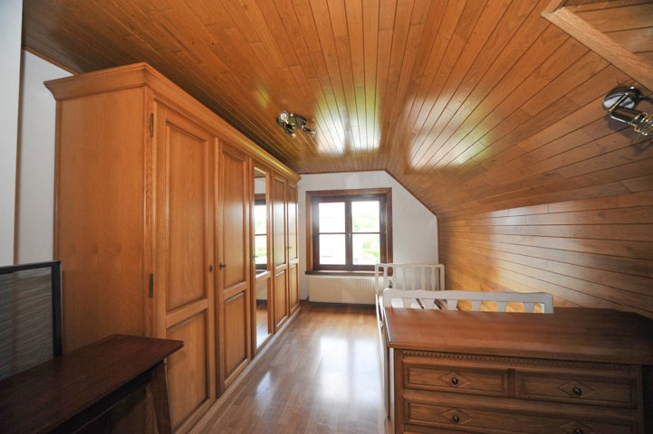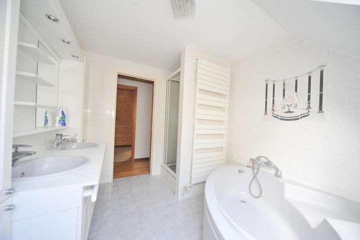 De badkamer is volledig uitgerust met ligbad, douche en dubbele lavabo. De zolder, bereikbaar via de nachthal, biedt bijkomende bergruimte of kan naar wens verder worden ingericht.