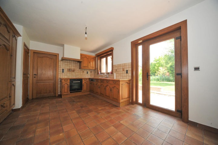 De aansluitende keuken is praktisch ingedeeld en rechtstreeks verbonden met de inpandige garage.